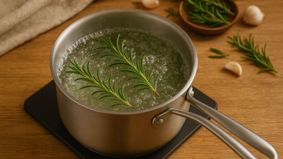 Поставете розмарина в тенджерата и го покрийте с вода на един пръст височина. Оставете водата до кипене, след което намалете температурата и оставете да къкри на тих огън. Десет до петнадесет минути са достатъчни за освобождаване на пълния аромат.