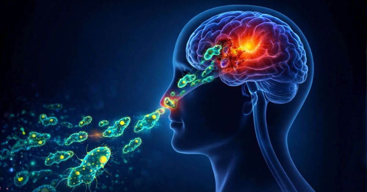 - Амебата пътува по носния нерв към мозъка